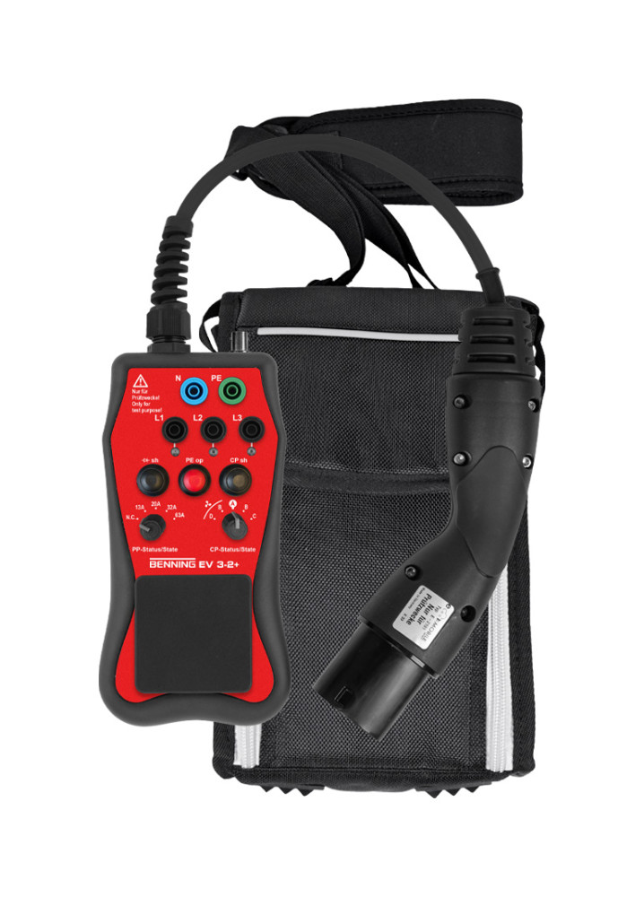 Der Messadapter BENNING EV 3-2+ ermöglicht mit dem Installationsprüfgerät BENNING IT 200 Sicherheits- und Funktionsprüfungen an bestimmten Ladestationen für Elektrofahrzeuge gemäß DIN VDE 0100-600 (IEC 60364-6) und DIN VDE 0105-100 (EN 50110) durchzuführen. BENNING EV 3-2+ ist für die Prüfung von Ladestationen gemäß DIN EN / IEC 61851-1 (VDE 0122-1) der Ladebetriebsart „Mode 3“ vorgesehen und besitzt einen Typ-2-Steckverbinder gemäß IEC / EN 62196. BENNING EV 3-2+ stellt den sicheren Kontakt zum BENNING Installationsprüfgerät her und löst durch Simulation eines Elektrofahrzeugs den Ladevorgang der Ladestation aus.