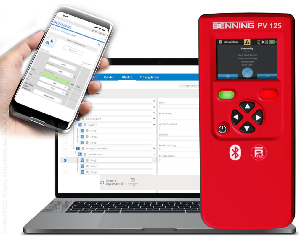 Benning SET PV 1000 (11002373)Das Benning SET PV 1000 dient zur Inbetriebnahme- und Wiederholungsprüfung von PV-Anlagen bis 1000 V.Prüfung gemäß DIN EN 62446-1...
